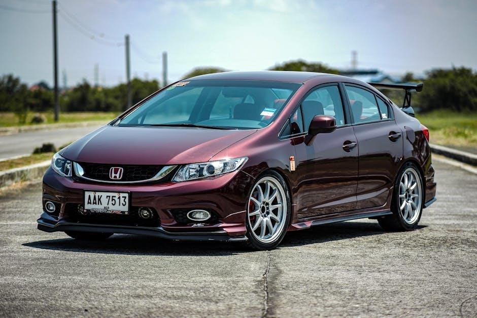 The 2016 Honda Civic owner’s manual details engine specs, dimensions, and capacities, providing crucial technical data for informed vehicle understanding and maintenance.